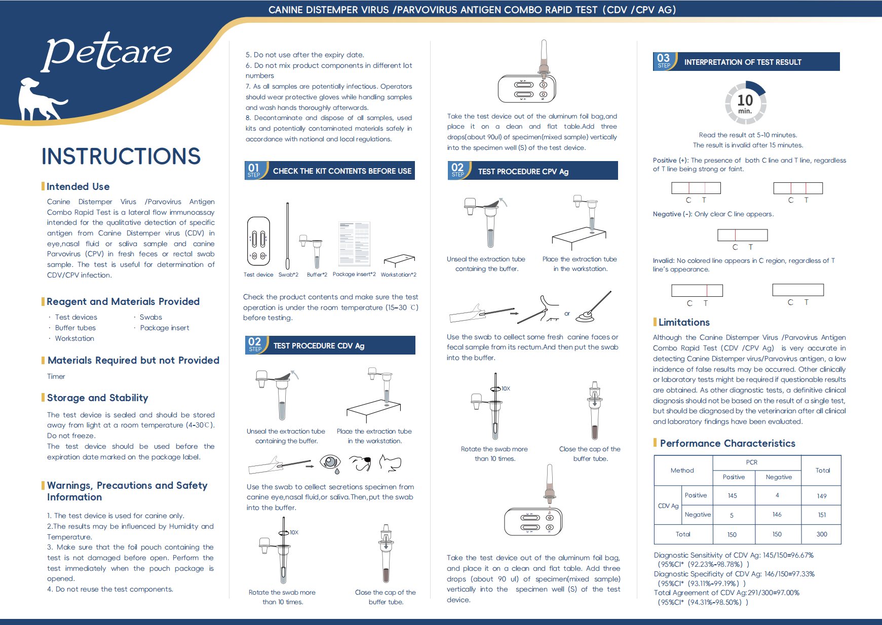 The Canine Distemper test works with dog’s secretions sample (ocular, nasal, pharyngeal, or anus), as well as serum or plasma sample.